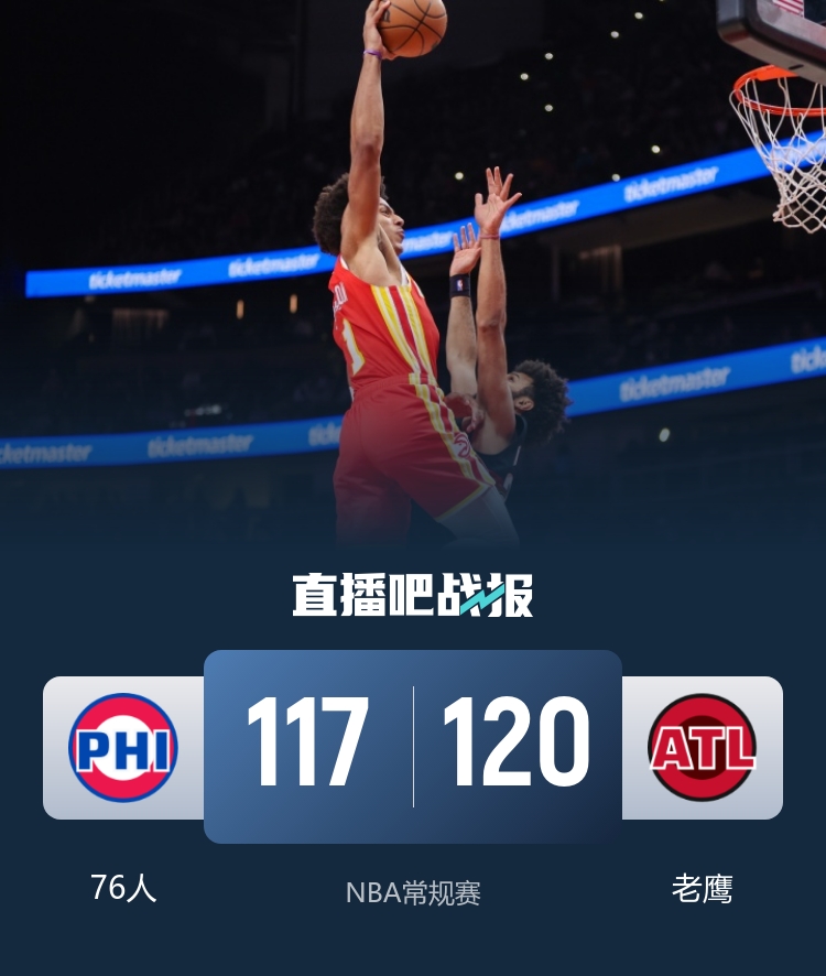 比赛开场,双方在外线都屡有建树,但76人在两分球区域命中率欠佳,老鹰这边众人发力,将分差拉开到两位数,首节结束以39-29领先。次节回来,乔治连续取分帮助球队缩小分差,此后双方陷入拉锯战,半场结束老鹰59-55领先4分。易边再战,两队依旧是交替取分,埃奇库姆和克雷伊奇外线连进,丹尼尔斯则是连续杀伤禁区予以回应,形成对飙,三节结束老鹰94-91依旧领先。末节回来,老鹰延续进攻势头再次将比分拉开,乔治连续取分帮助球队止血,但老鹰还是能维持优势,终场结束前76人追到只差1分,但绝杀球连续不中,最终老鹰主场120-117险胜76人。