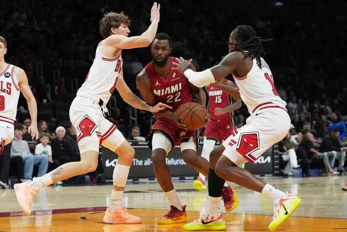 热火上一场客场116-113险胜公牛,公牛过去3场连输湖人、步行者与热火遭遇3连败,本赛季前两次交锋热火均客场战胜公牛。本场热火缺少鲍威尔、希罗、米切尔与罗齐尔,公牛缺少吉迪、怀特、武切维奇等。首节前4分半钟热火3-12落后,热火连追5分,公牛连得4分。热火持续反扑追到17-20落后,卡特三分命中,维金斯三分回敬,公牛内外开花扩大9分优势。热火再追3分,首节结束热火25-31落后公牛。首节公牛24中12,其中三分11中4,热火26中9,其中三分12中3。
