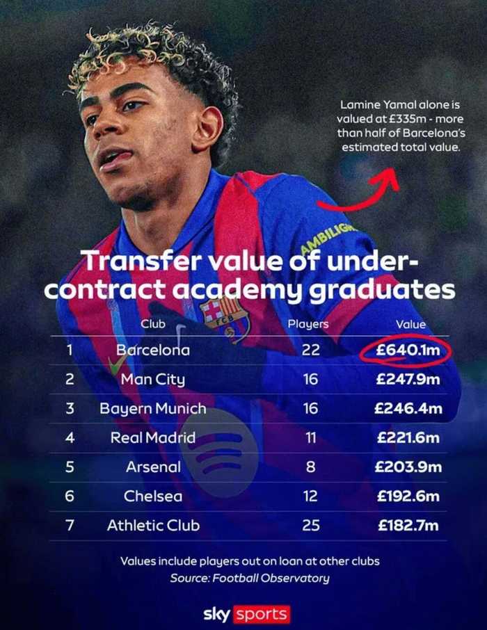 据足球天文台统计,曼城、阿森纳和切尔西是英超青训营毕业生身价最高的俱乐部,而巴塞罗那队中22名现役青训营毕业生的总身价估计高达6.4亿英镑。