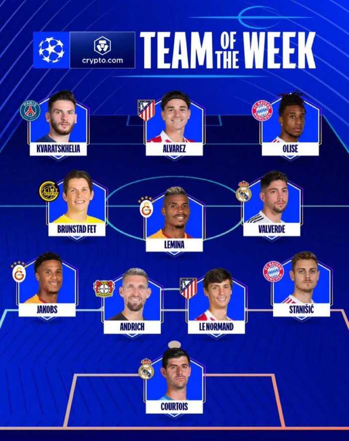 欧冠1/8决赛首回合战罢,欧冠官方公布了本周最佳阵容,巴尔韦德、奥利塞、阿尔瓦雷斯、克瓦拉茨赫利亚等人在列。