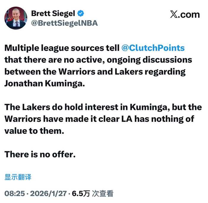 Brett Siegel今天否认了Evan Sidery关于湖人与勇士谈交易的报道: