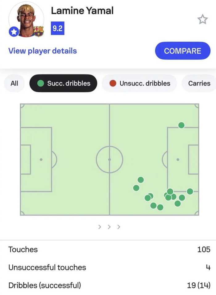 根据Sofascore的统计,亚马尔在本场比赛完成14次成功过人,而五大联赛最近两次有球员在单场比赛里完成至少14次过人的壮举,都是亚马尔所为:(日期取当地时间)
